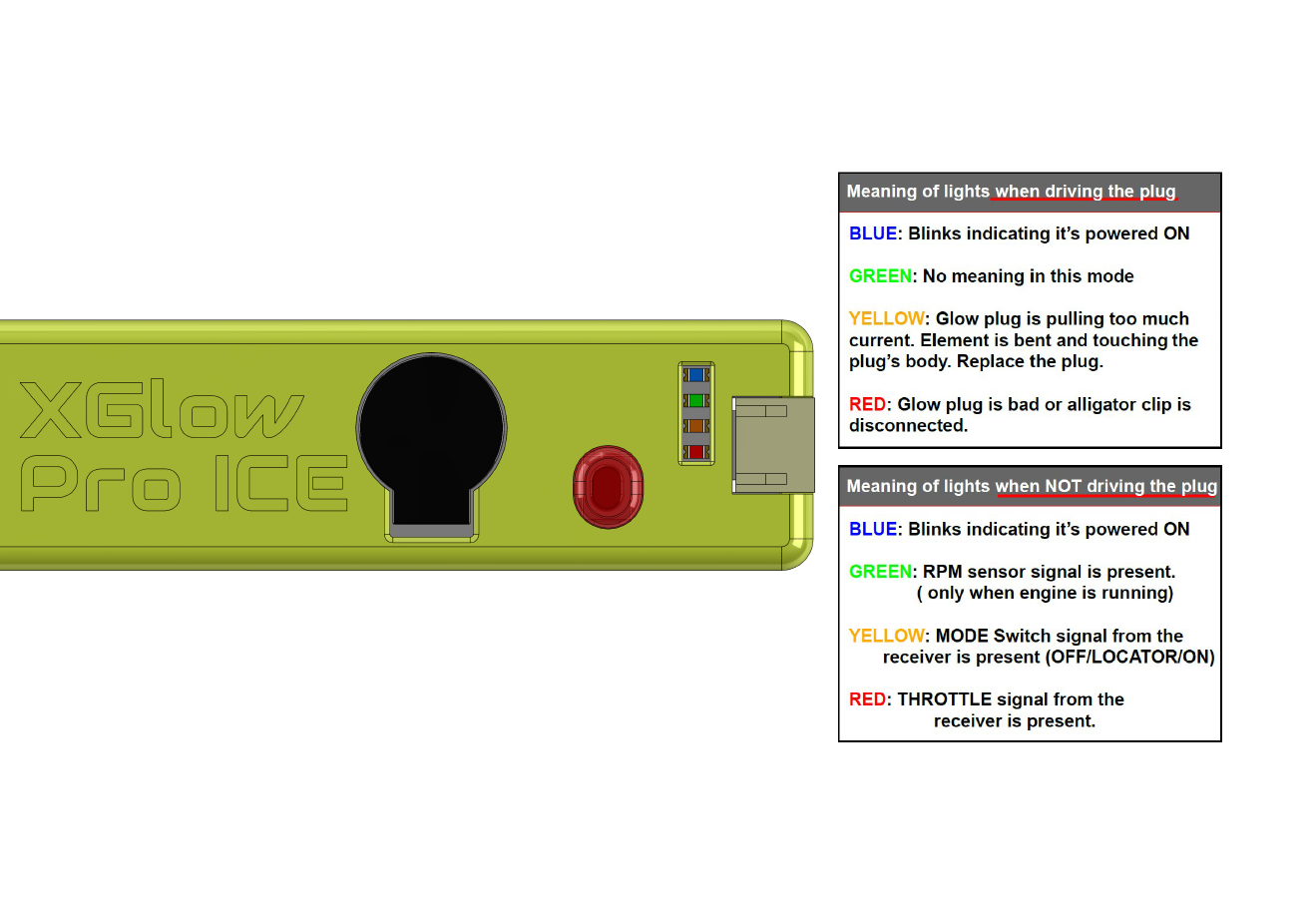 Like the V3, the ICE V4 has a replaceable screw-type case for when you want to have the case replaced. New firmware increases protection of the glow plugs. Colder operation due to the ICE technology, reverse polarity protection, louder buzzer with new technology. The XGlow Pro ICE V4 is the most advanced glow igniter to date. It includes the standard glow igniter function but it adds additional functions like anti-chicken-dance, anti-hot-starts, good-bad glow plug sensor, wide voltage range of 6V-12V providing constant glow-plug glowing at any voltage level, craft Locator Buzzing Horn controlled by a radio switch. Voltage monitor with LED lights and emergency Buzzing Horn when critical low and when Anti-Hot-Starts feature is activated.
